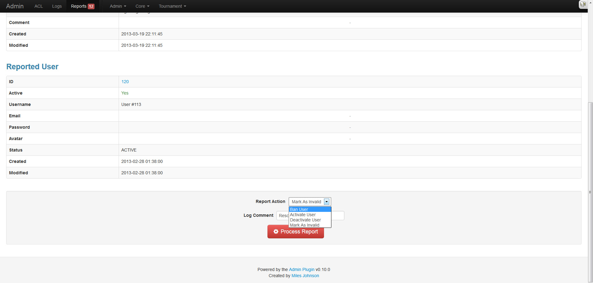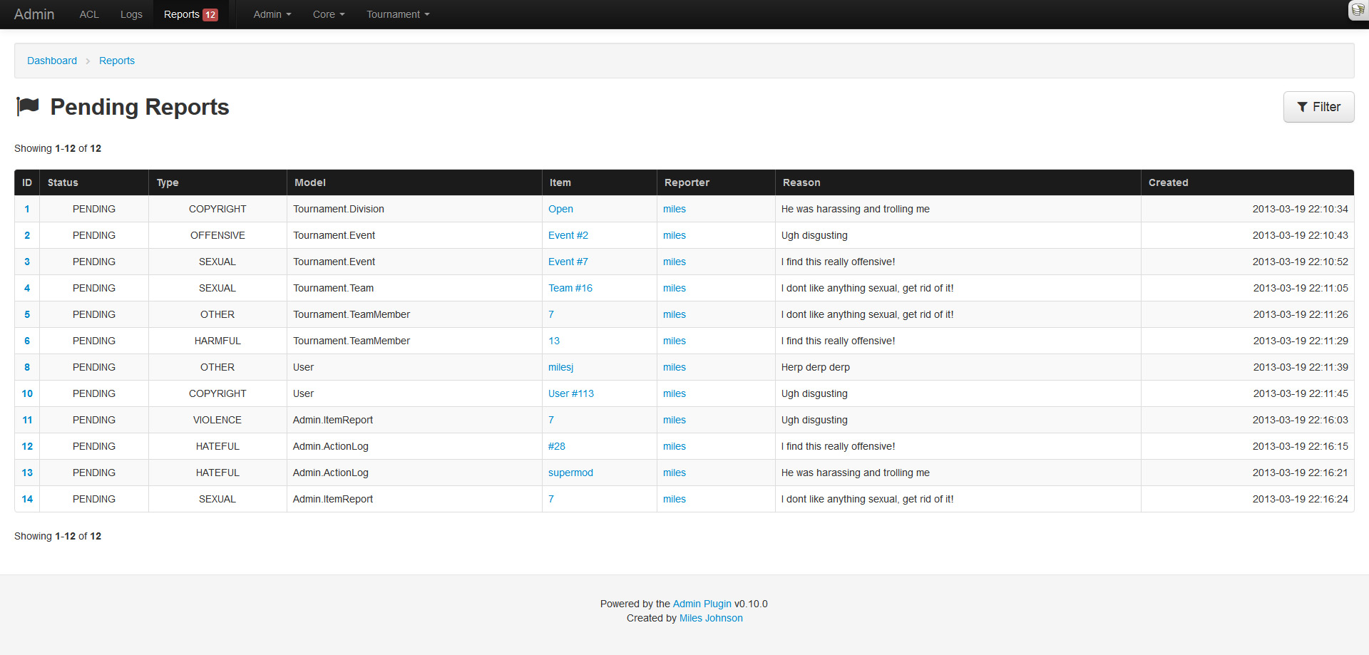 Another useful feature that many sites utilize is a content reporting/flagging system. My forum plugin utilizes one, my tournament plugin will, and my applications do. Each of them rolled their own system, so I thought it would be easier to roll this feature into the admin and have them all extend from it.