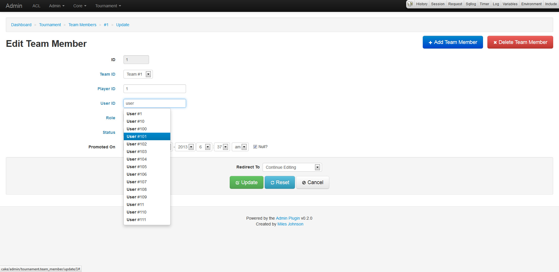 The create and update pages work in a similar fashion. Every form has functionality derived from the models validation rules, database schema and associations. This allows for input fields to set requirements, null checks and more. Any belongsTo field is represented as a drop down list or a type ahead field (depending on how many records exist in the database). Forms also provide minor support for hasAndBelongsToMany relations.
