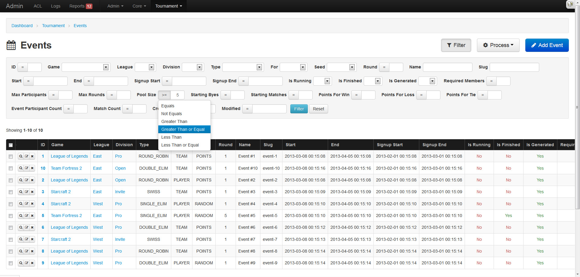 Integer and date fields provide a comparison dropdown that lets you choose the operator to use: less than, not equals, etc. Dates allow for any kind of input and will be strtotime() on the backend. Enumerables, booleans and belongs to relations will be represented as a dropdown. Strings will result in a LIKE %% query. Any active filter will be highlighted in yellow.