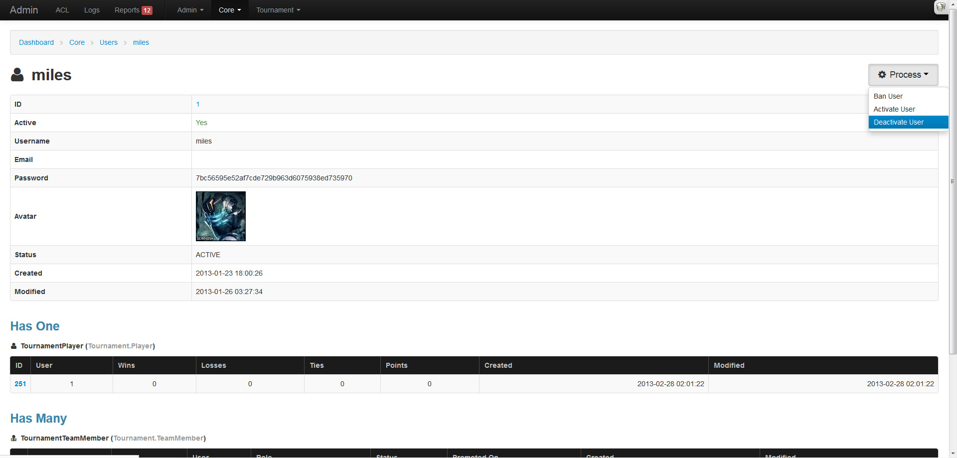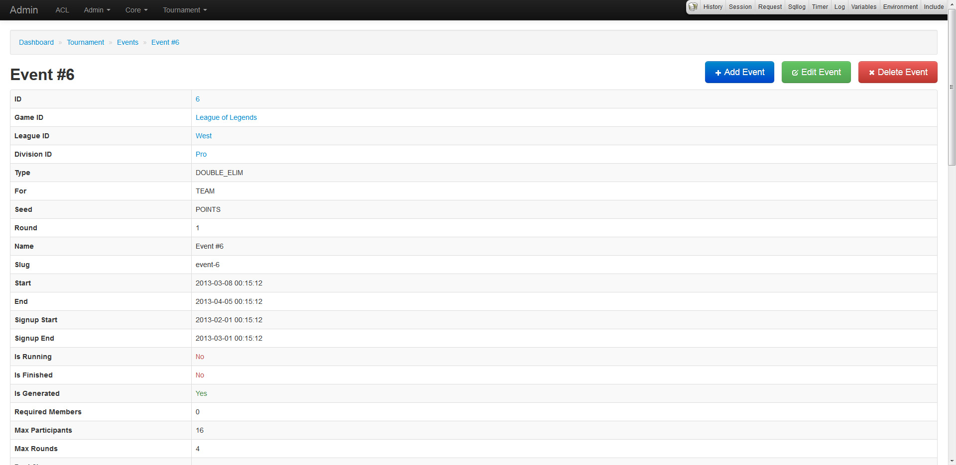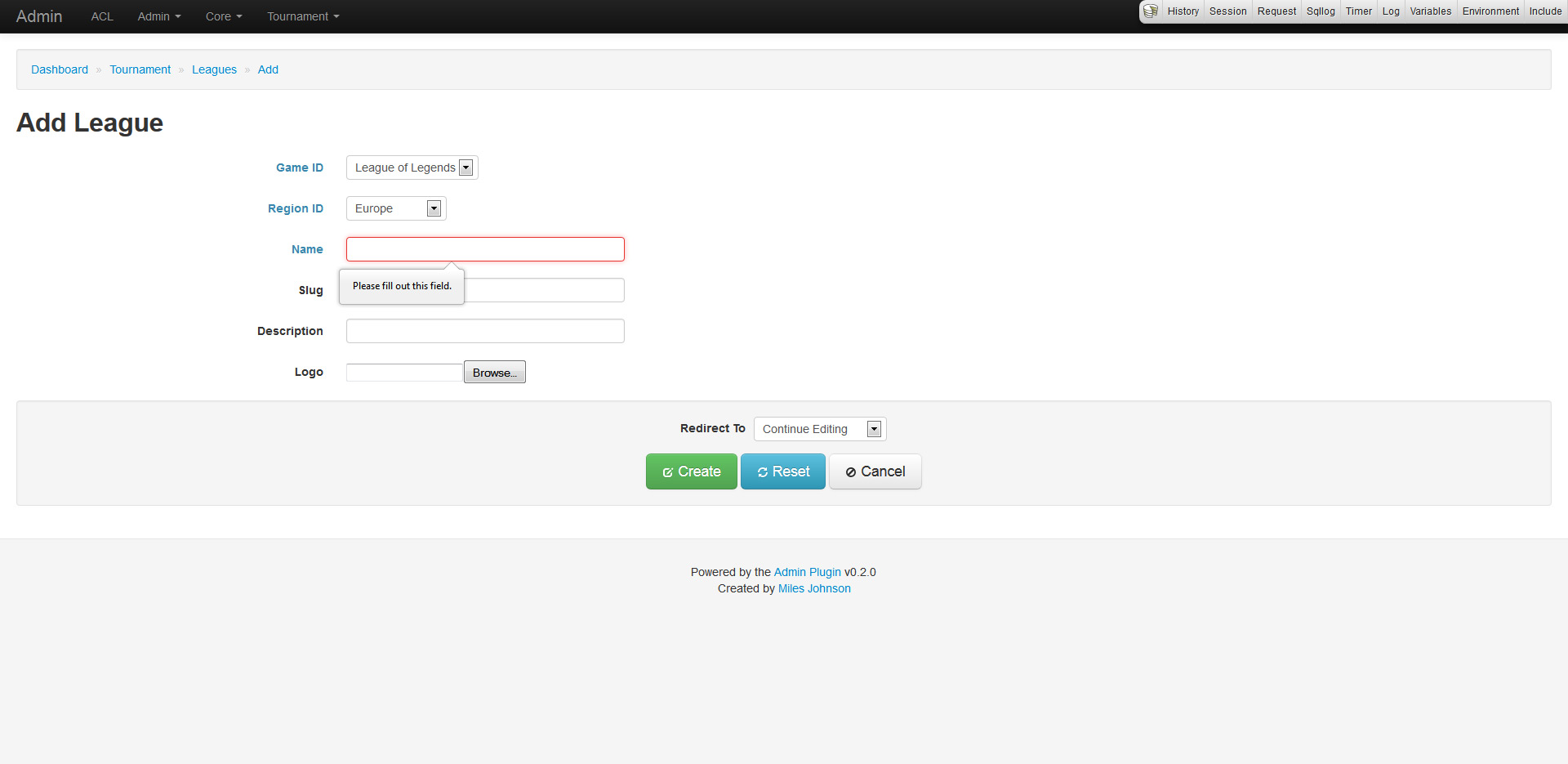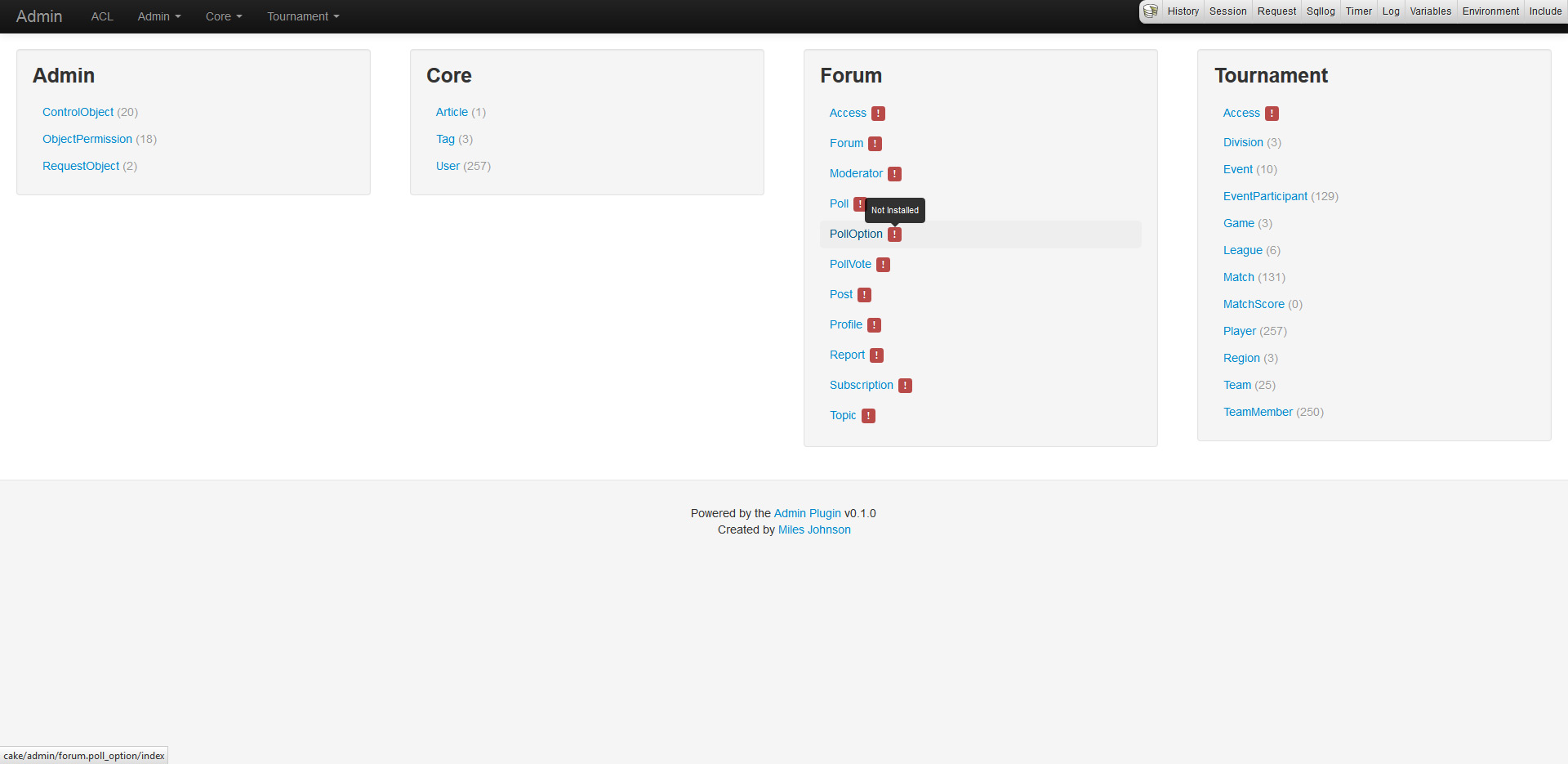 So with no viable option, I went ahead and built this plugin over the past week, aptly named Admin. The plugin meets all the requirements I listed above and then some. Let me take you on a wonderful tour of its features and functionality. In my quick little demonstration, I will be using a test application that also uses the Forum and Tournament plugins that I wrote.