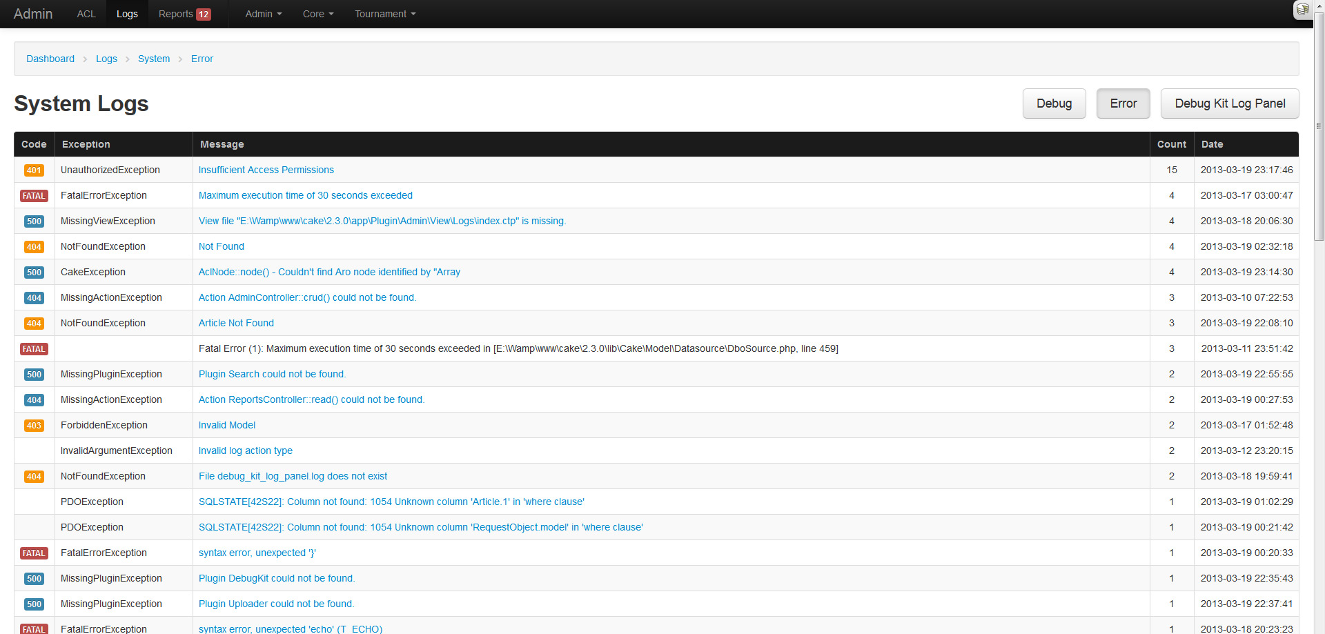 Nearly 2 weeks ago I talked briefly about the CakePHP admin plugin I was building. Since then I have tagged 10 minor versions with many new features and bug fixes. I spent a good chunk of my time testing the admin against my current applications and attempting to fix any issues. I can only do so much testing by myself, so if any of you end up testing the plugin, I would greatly appreciate some feedback!