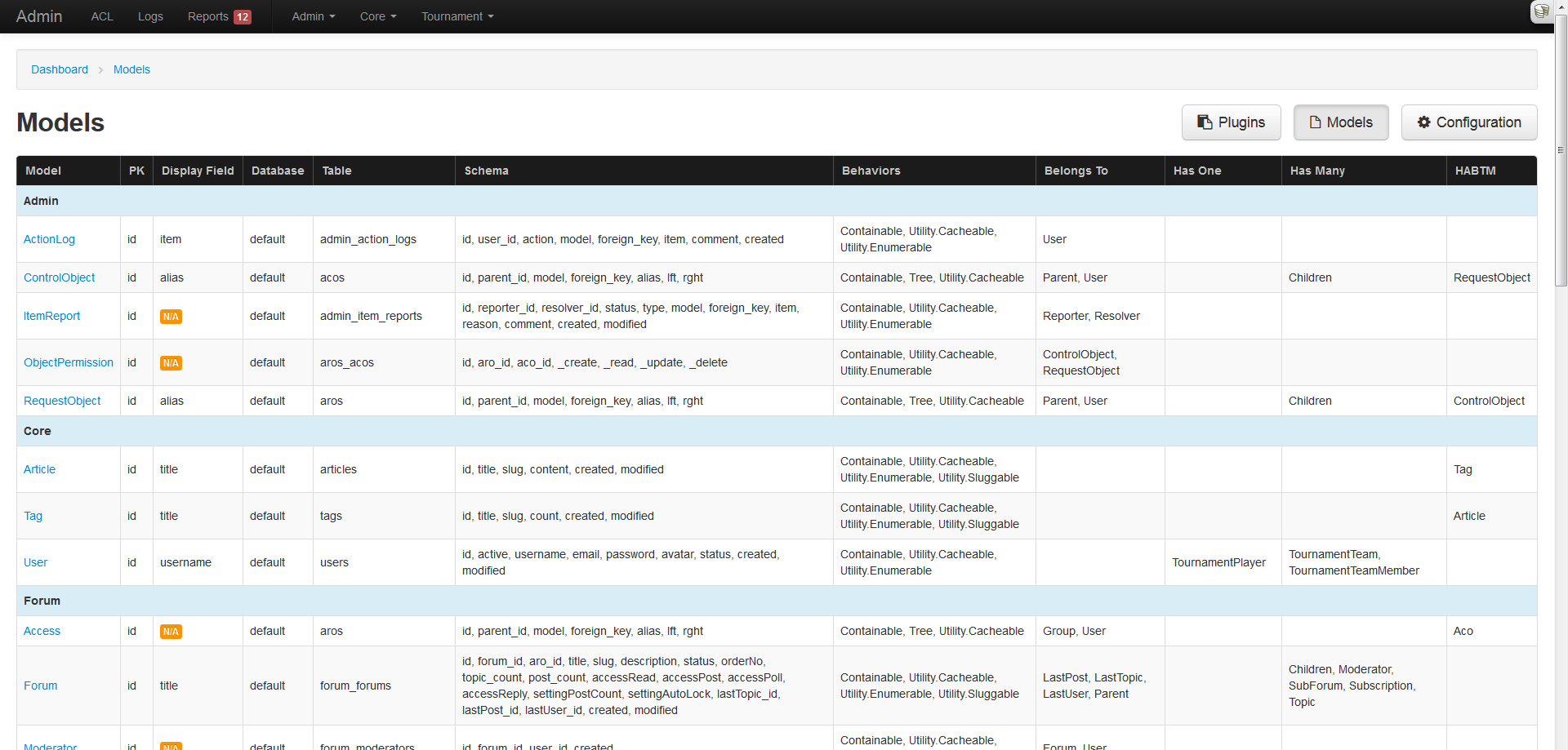 Wouldn't you agree? That's why the plugin supports moderate CRUD functionality for all models, including plugins, right of the box (not really, but requires minor installation). No controllers are needed as every model is URL routed and mapped allowing quick development. The system relies heavily on a models property definitions (display field, primary keys, associations, database schema, etc) to generate and provide strict functionality. CRUD also makes use of ACL allowing users and groups specific access.
